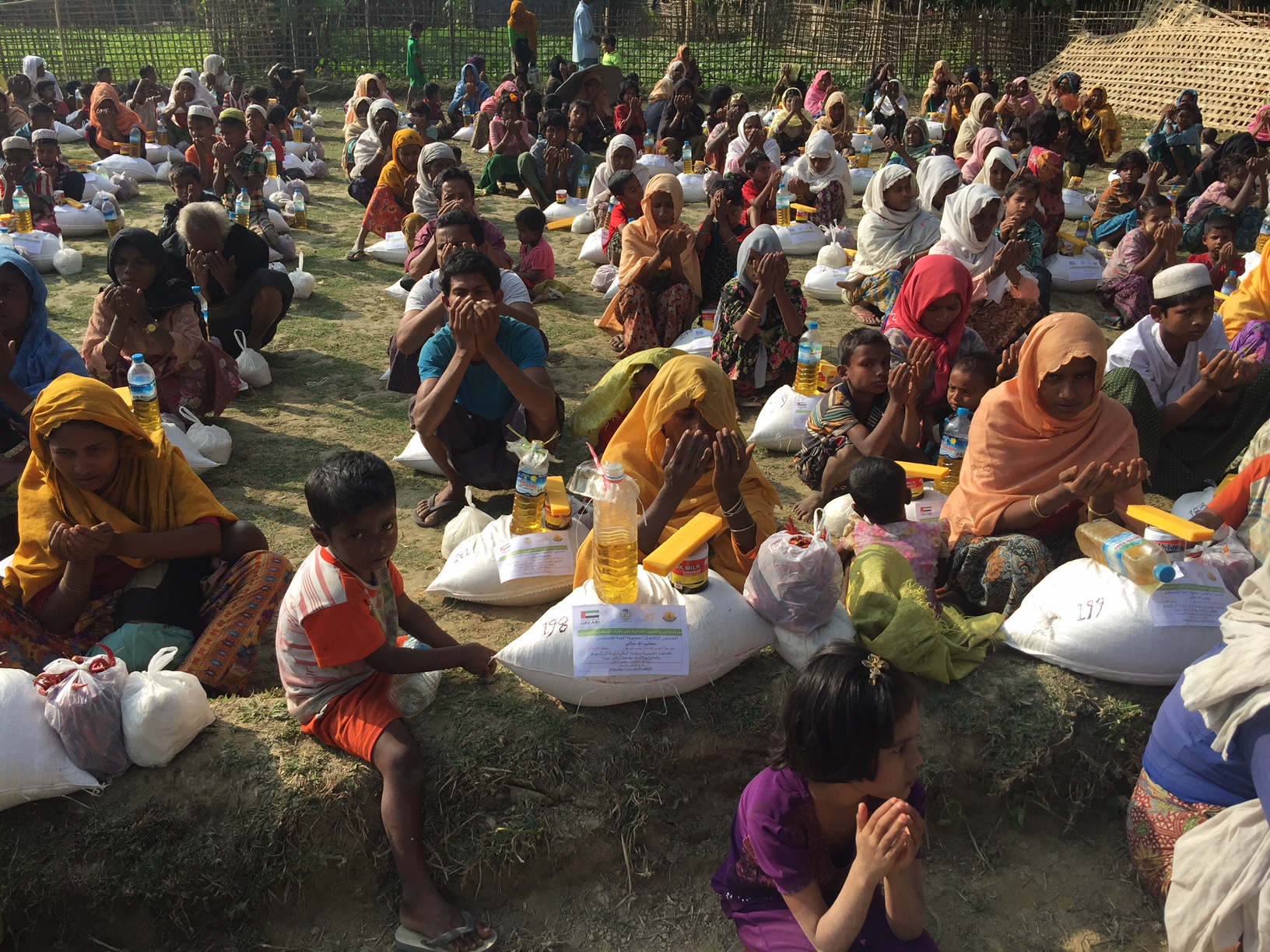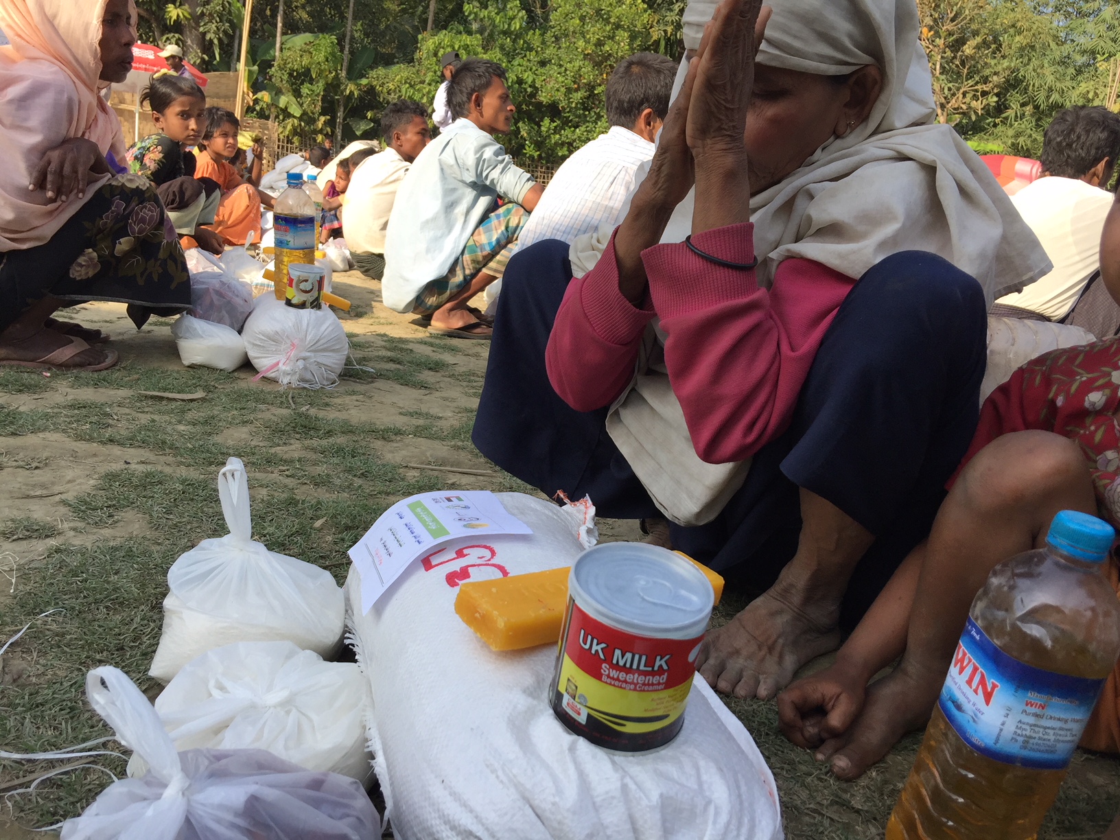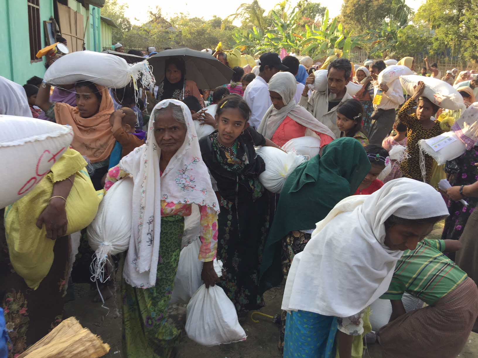 Rohingya wait in line for hours as an emergency food distribution is organized by the World Food Program and Save the Children. Rice, lentils, sugar, salt, and oil are given out, Oct. 7, Kutupalong, Cox’s Bazar, Bangladesh. Photo: Paula Bronstein/Getty Images